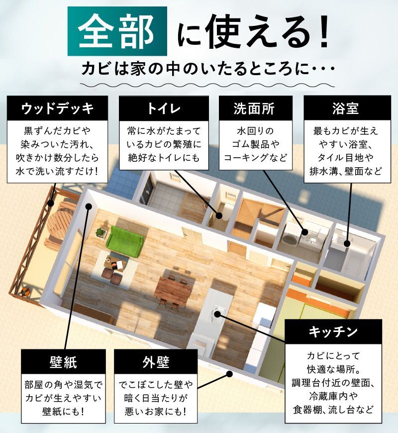 ふき取りでいいから、水で流せない窓などのコーキングなどのカビ取りもできてとても助かります。